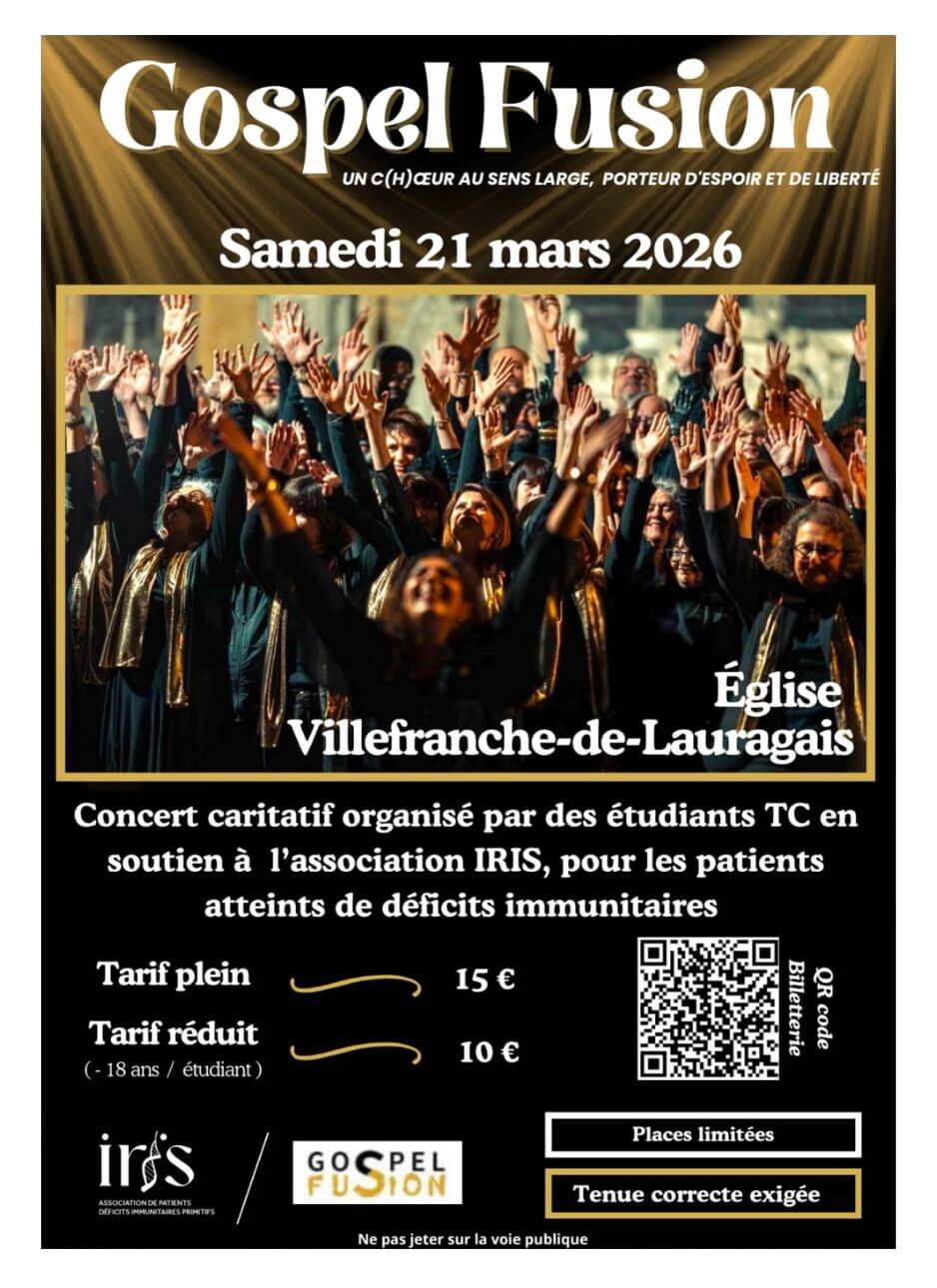Concert caritatif 21 mars 2026 VILLEFRANCHE-DE-LAURAGAIS, Haute-Garonne Eglise Notre-Dame de l'Assomption Google Maps Amis de La Région Occitanie / Pyrénées-Méditerranée Rendez-vous le 21 mars de 18h30 à 20h à Villefranche-de-Lauragais pour un concert au profit d’IRIS Inscription : https://urls.fr/Q1wqr1 Cet évènement est organisé par les étudiants du BUT Technique de commercialisation de l’Université de Toulouse, qui soutiennent les patients au travers de différents projets. Un grand merci pour leur investissement Partagez sur vos réseaux ! Facebook Instagram