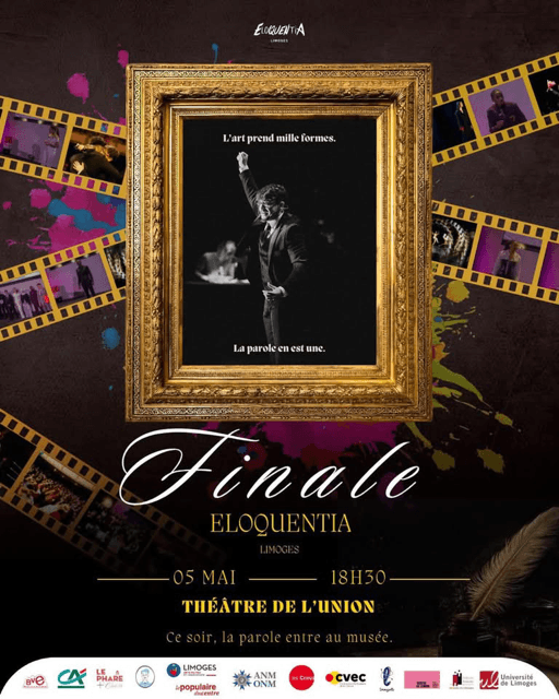 Concert pour la finale d’Eloquentia 5 mai 2026 19h30 LIMOGES, Haute-Vienne Théâtre de l'Union Google Maps Places gratuites mais limitées !Eloquentia Limoges – La Finale Le Théâtre de l’Union ouvre ses portes à une soirée où l’art prend vie. Ici, les mots deviennent des pinceaux, les silences sculptent les émotions, et chaque discours est une œuvre. Le thème : l’art. L’arme : la parole. La scène : un espace de création. Les finalistes monteront sur scène pour une finale d’exception, où l’éloquence se transforme en performance artistique. Viens découvrir les talents qui feront vibrer le public et laisse-toi emporter par cette célébration de l’art sous toutes ses formes. Ne manque pas ce moment unique. Réserve ta place dès maintenant. Partagez sur vos réseaux ! Facebook Instagram