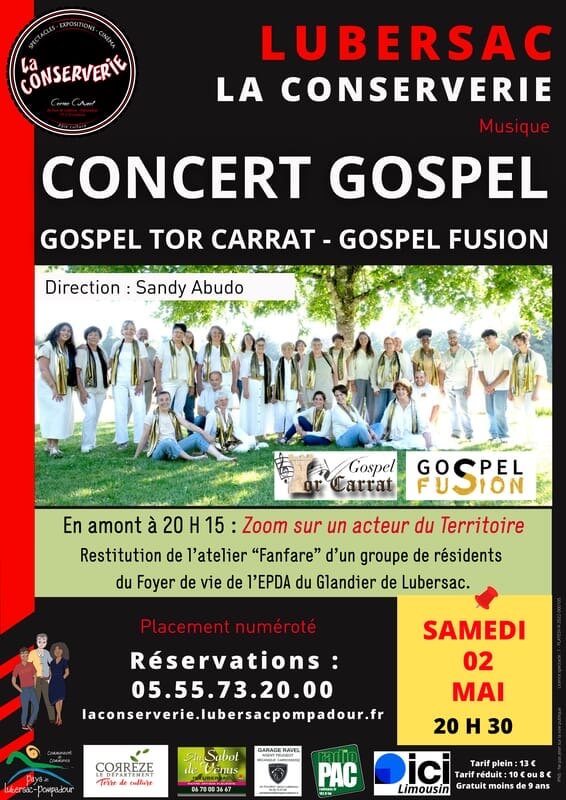 Concert Gospel Tor Carrat 2 mai 2026 LUBERSAC, Corrèze Centre Culturel La Conserverie Google Maps Infos et résevation au : 05.55.73.20.00https://laconserverie.lubersacpompadour.fr/programmation/soiree-gospel Partagez sur vos réseaux ! Facebook Instagram